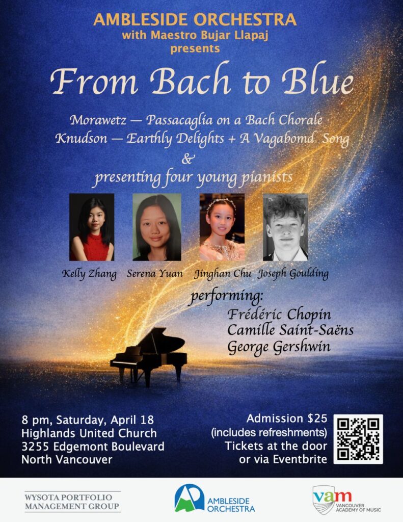 The Ambleside Orchestra, directed by Maestro Bujar Llapaj, will be performing two works (“Earthly Delights”, and “A Vagabond Song”), by Elizabeth Knudson, as part of their upcoming season. The concert is on Saturday, April 18th, 2026, at Highlands United Church, 3255 Edgemont Boulevard, North Vancouver, B.C.