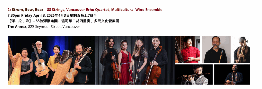 “September Songs” commissioned by the Vancouver Erhu Quartet, by Canadian composer Elizabeth Knudson, will be performed as part of the 7th Annual Sound of Dragon Music Festival (April 2nd-5th, 2026). The concert is on Friday, April 3rd, at 7:30pm, at the Annex, 823 Seymour Street, Vancouver.
